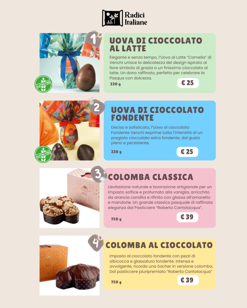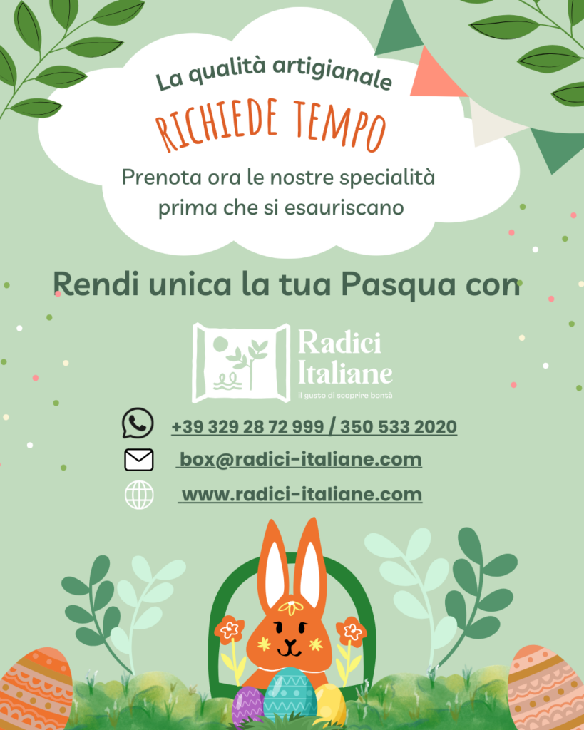 Scopri i prodotti pasquali artigianali di Radici Italiane: colombe, uova di cioccolato e box regalo. Ordina via mail o WhatsApp e ricevi in tutta Europa